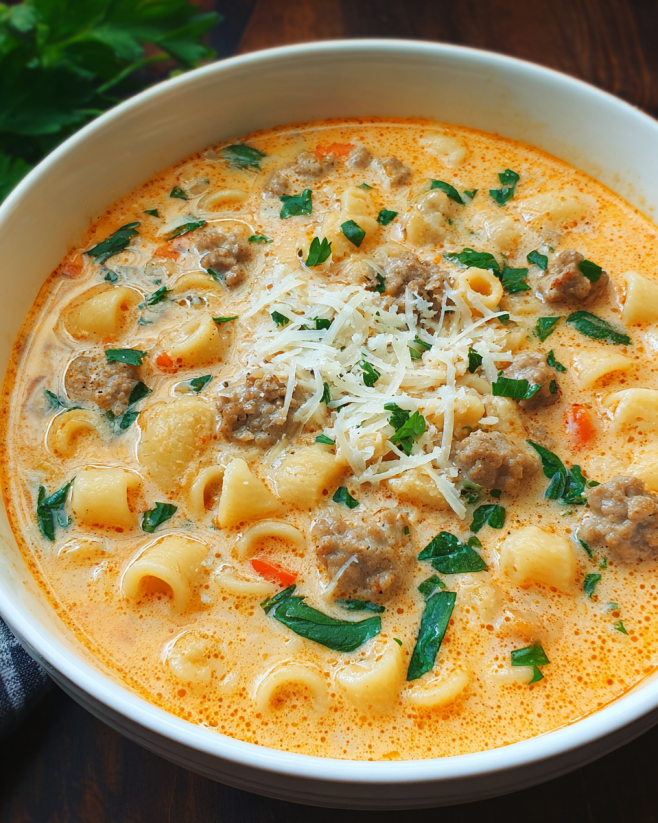 Creamy Parmesan Sausage Ditalini Soup warms your soul.